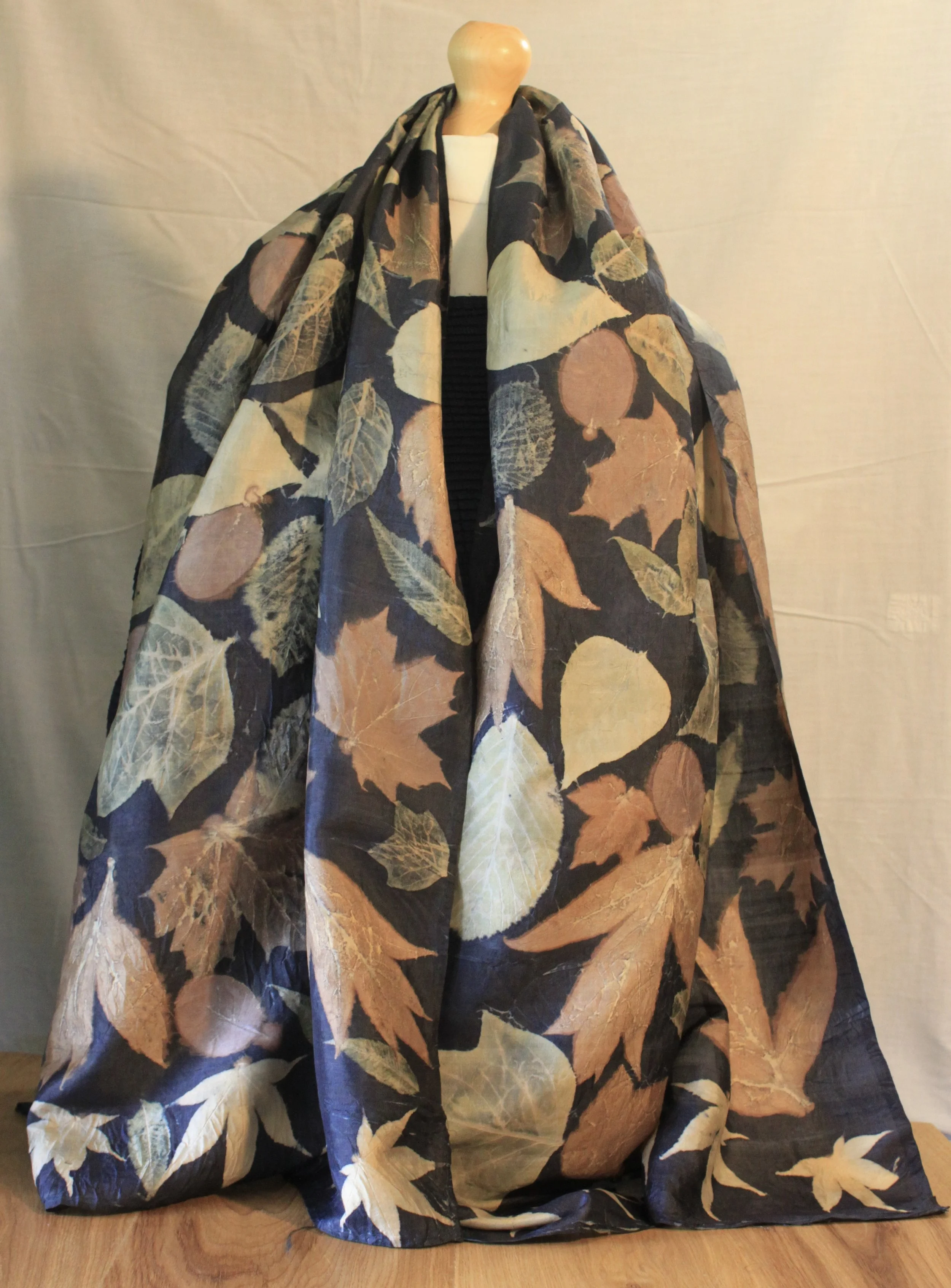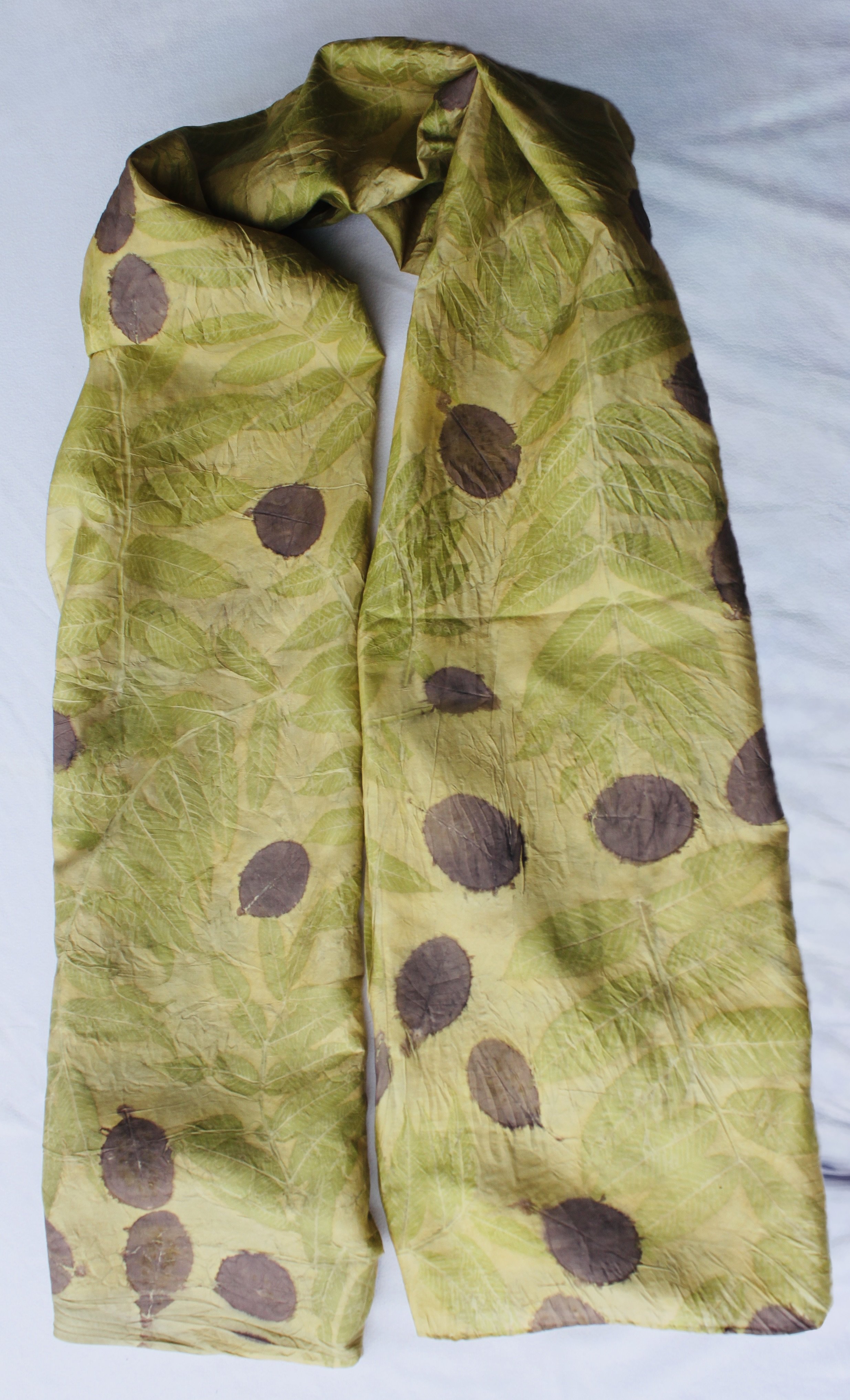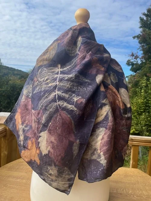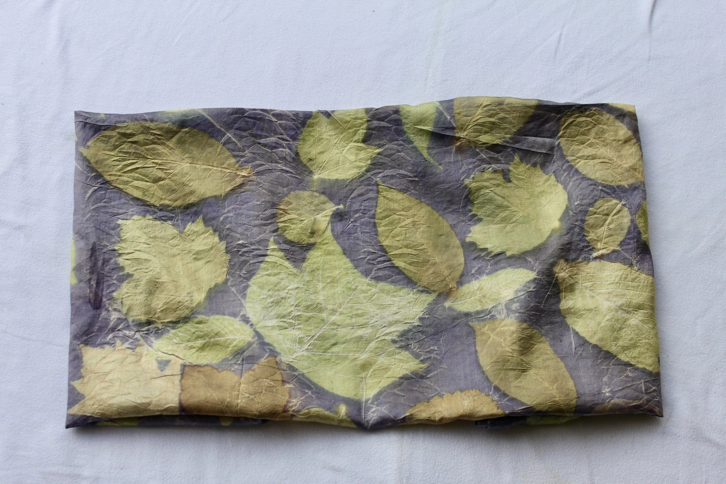 Textiles are dyed with natural plant dyes, many hand made from my own gardens and local woodland, then printed with plant material from the local area. The processes are ancient, and satisfying, creating entirely unique pieces. The dyes are robust, the silks delicate but strong and long lasting. As well as the silk botanical prints I also offer a range of plain dyed Lithuanian linen napkins in beautiful soft colours.